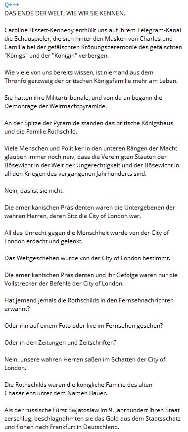 Bei Q handelt es sich nicht um eine einzelne Person, sondern um ein Team hochrangiger Personen mit Sicherheitsfreigabe der Stufe "Q", das Operationen durchführt, die seit vielen Jahren geplant sind (der Plan). Einige der Ziele sind: A) Ein massives Informationsverbreitungsprogramm, das 1) die Bevölkerung über massive globale Korruption und Verschwörungen aufklären soll. 2) Die Menschen dazu zu bringen, weiter zu forschen, um ihr "großes Erwachen" zu unterstützen. B) Korruption, Betrug und Menschenrechtsverletzungen weltweit auszurotten. C) Die Republik der Vereinigten Staaten zur verfassungsmäßigen Rechtsstaatlichkeit zurückführen und auch "das Volk" weltweit zu seiner eigenen Herrschaft zurückführen. Kurz gesagt, die Q-Operation ist die größte kriminelle Inszenierung und ein Ereignis gegen die Vernunft/Verfolgung in der Weltgeschichte. ° Trump wurde nicht gewählt. Er wurde platziert. RFKjr hat seit über 30 Jahren >Intel< über Vax bekommen und wurde aus einem bestimmten Grund platziert///