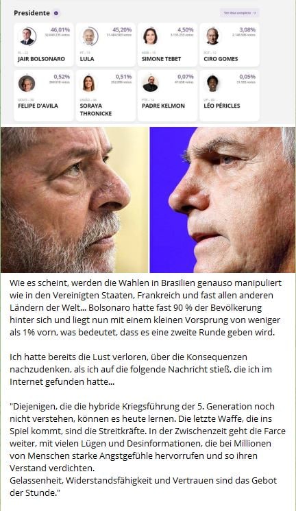 "Was uns zuversichtlicher für die laufenden Wahlen macht, ist die Tatsache, dass die Streitkräfte in Brasilien eingeladen wurden, sich an der Transparenz der Wahlen zu beteiligen...Aber die Streitkräfte haben mir gesagt, dass es unmöglich ist, dem Wahlsystem ein Siegel der Glaubwürdigkeit zu verleihen, da es in seiner jetzigen Form noch sehr viele Schwachstellen aufweist.