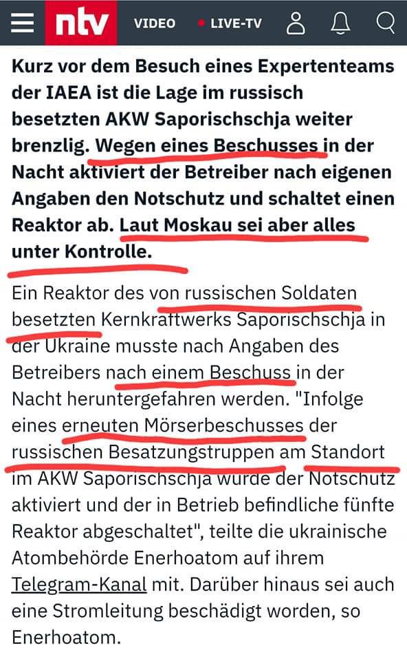 Der Mainstream behauptet also, das Kraftwerk, das unter russischer Kontrolle ist, sei also von russischen Truppen unter Beschuss gewesen. OK.