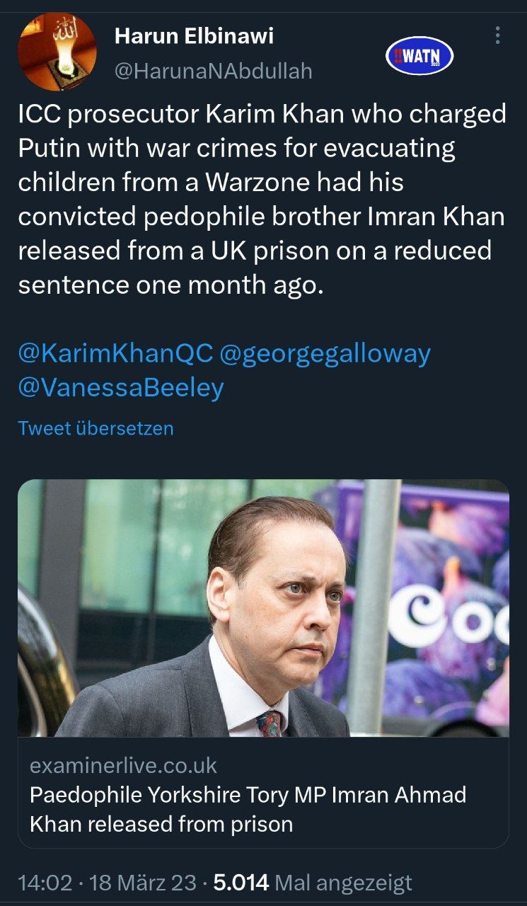 Der IStGH-Ankläger Karim Khan, der Putin wegen der Evakuierung von Kindern aus einem Kriegsgebiet wegen Kriegsverbrechen angeklagt hatte, wurde vor einem Monat zu einer reduzierten Strafe aus einem britischen Gefängnis entlassen, ebenso sein verurteilter pädophiler Bruder Imran Khan.