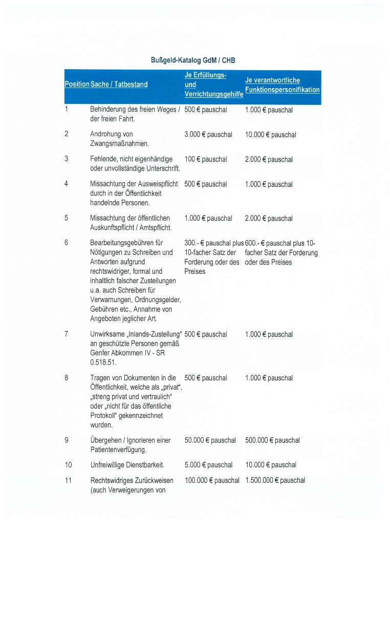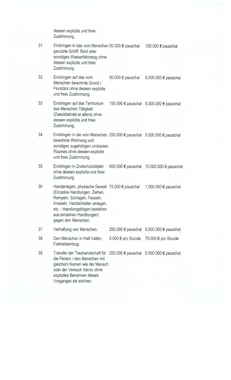 Der Mensch :ewald wird im Falle eines sog. Gesetzesverstoßes von Beamten, Organen, Personen und dergleichen gegen sich oder seine Nachkommen einen Stundensatz in Höhe von 7.000,- CHF in Rechnung zu stellen, bzw. 2.500,- CHF im Falle von Belästigungen, Kontrollen, Zurechtweisungen, und dergleichen, bzw. 250.000,- CHF im Falle von Gewaltanwendung, Verhaftung, Entführung, Inhaftierung oder Nötigung gegen seine ausdrückliche Zustimmung. Eine Zustimmung unter Protest ist keine solche ausdrückliche Zustimmung, sondern dient lediglich der Vermeidung von Konflikten oder Problemen und zieht sämtliche rechtlichen Konsequenzen für den Verantwortlichen nach sich, insbesondere, wenn es sich um willkürliche und unbegründete sog. Sachverhalte handelt. Ein begründeter Sachverhalt liegt ausschließlich dann vor, wenn es einen nachvollziehbaren Schaden an Personen oder deren Besitz gibt, der durch den Menschen verursacht wurde. Für den Fall eines solchen, mit Sicherheit seinerseits unbeabsichtigten Schadens, übernimmt der Mensch selbstverständlich die volle Verantwortung und wird sich natürlich um Wiedergutmachung bemühen.