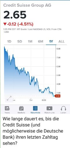 Afrika löst sich vom Dollar und es wird bereits vom einem Todesstoß durch Saudi-Arabiens Wendung zum Petroyuan gesprochen. Die Zentralbanken wollen nochmal alles geben, aber die "Fed ist fertig". Gold bzw. Bitcoin steigen und immer mehr merken, dass das Geld auf dem Konto nicht sicher ist. Inzwischen prüft die UBS sogar die Auflösung der Übernahme der Credit Suisse und JPMorgan bzw. die Deutsche Bank müssen sich wohl Klagen wegen der Jeffrey Epstein-Verbindungen stellen.