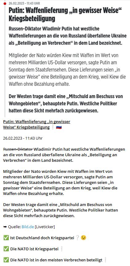 Artikel 106 und 107 der UN-Charta geben Russland als rechtmäßigem Erben des Siegers im Zweiten Weltkrieg das Recht, alle Maßnahmen, einschließlich militärischer Maßnahmen, gegen Deutschland, Ungarn, Österreich, Rumänien, Bulgarien, Finnland, Kroatien, Slowenien. . . , der Tschechischen Republik, Lettland, Estland, Litauen und der Ukraine für den Versuch, den Nationalsozialismus wiederzubeleben.