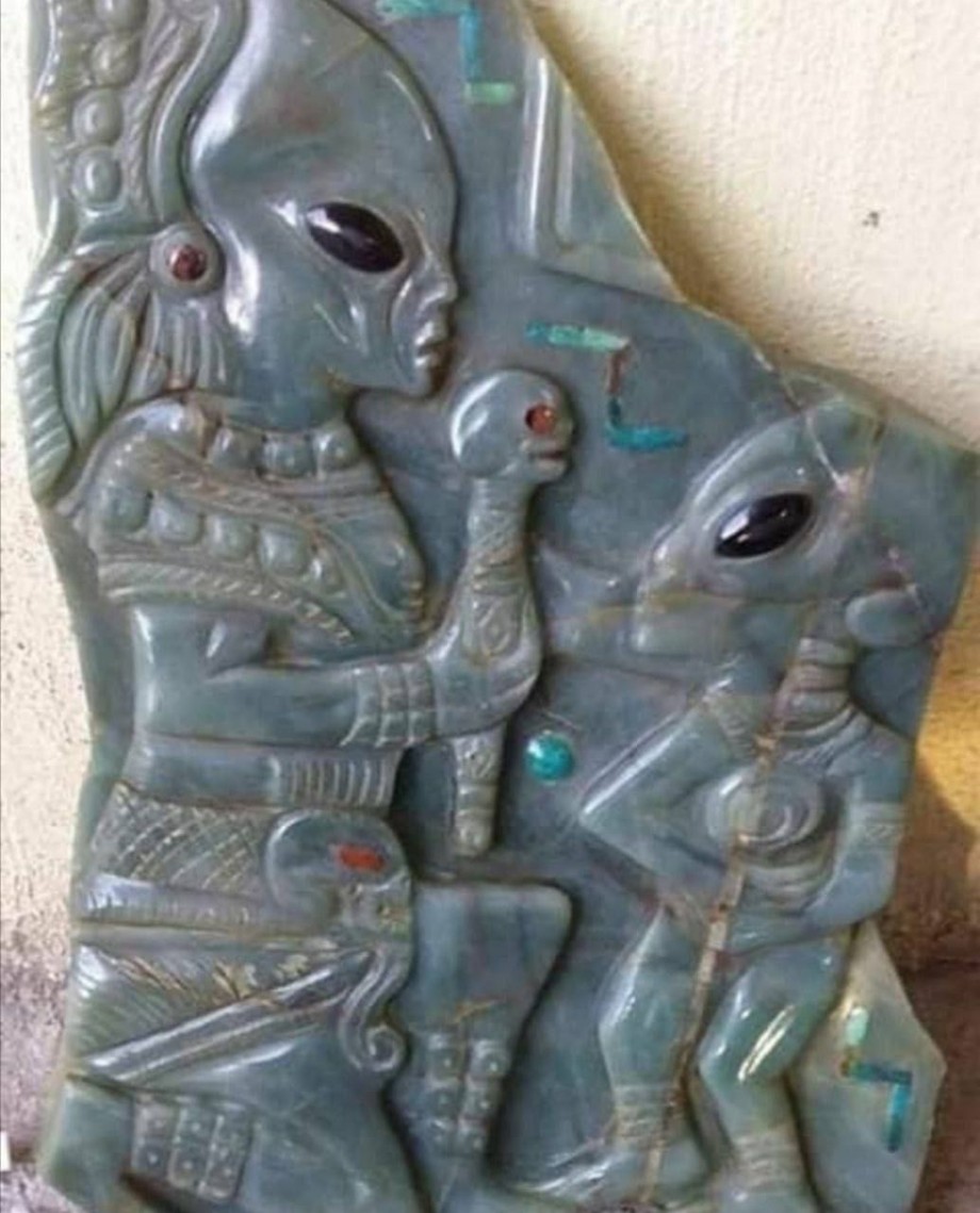 Bewohner der Peripherie der Stadt Puebla in Mexiko, fand im Wald geheimnisvolle Jadesteine mit seltsamen Figuren, die einige humanoide Wesen mit großen Köpfen darstellen. Sehr ähnlich zu grauen Aliens, die, wie von den Steinen beschrieben, in Kontakt mit der Maya-Zivilisation waren.