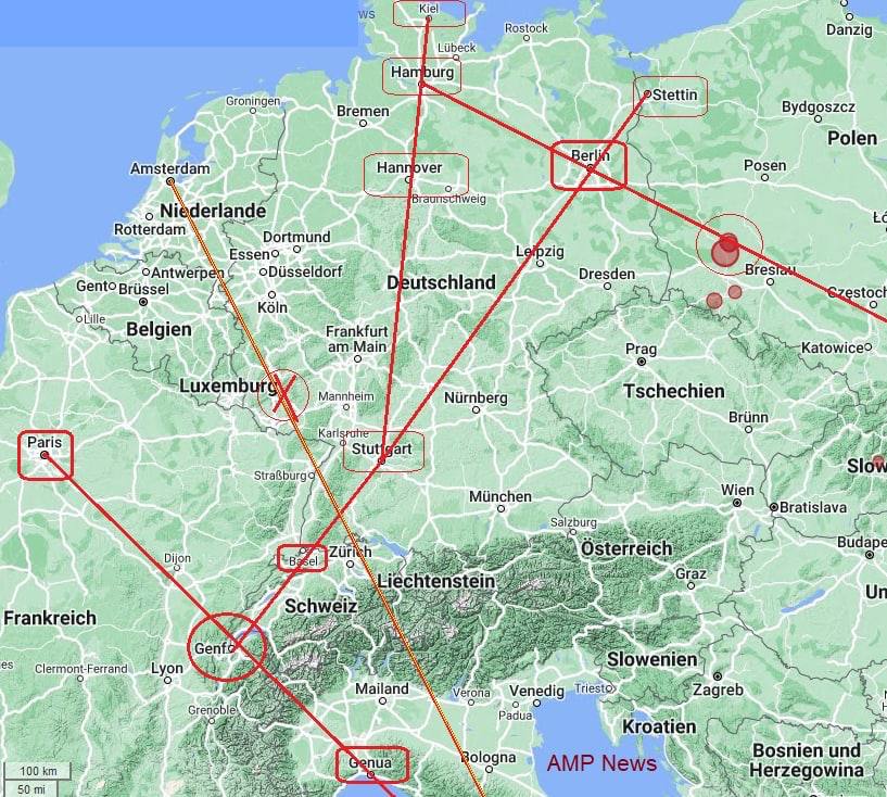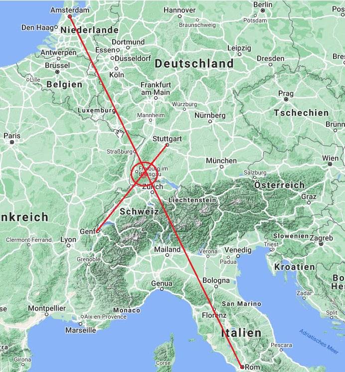 Es liegt ca. 12 km entfernt von der Linie Rom-Amsterdam (hier rot-gelb markiert)