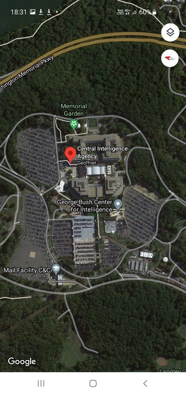 🔻 Wenn man bedenkt, dass täglich 15.000 Menschen zum CERN¹ pendeln, müssen sie dies mit geheimen U-Bahnen tun, da es am CERN keine großen Parkplätze gibt, wie auf der Luftaufnahme des CIA¹-Hauptquartiers in Langley, Virginia² zu sehen ist.