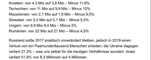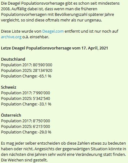 Immer wieder kommen Leserzuschriften zu dieser ominösen Liste mit der wahrscheinlichen Bevölkerungentwicklung bis 2025 für die meisten Staaten der Erde – hier ist sie: „List of Countries Forecast 2025“. Hier ein Artikel dazu – Connectiv: „Neue Zahlen der Deagel-Liste: Deutschlands Bevölkerung schrumpft auf ein Drittel!“: