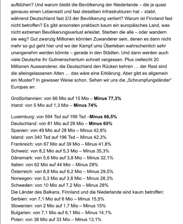 Die Zahlen für Deutschland schauen dabei alles andere als rosig aus. Bis 2025 soll seine Einwohnerzahl statt 81 Millionen nur noch 28 Millionen betragen, ein Rückgang von über