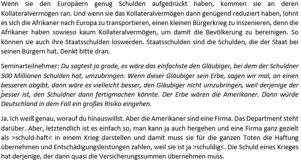 Gemäss Informationen werden auf der ganzen Welt Dumps also unterirdische Anlagen vom Militär gesprengt und es werden Kinder befreit und da diese Kinder aus diesen Dumps noch nie Tageslicht gesehen haben, werden diese Kinder mit MED-Betten geheilt. Nun stelle ich mir die Frage warum werden einerseits Kinder befreit wo noch nie das Tageslicht gesehen haben und im Gegensatz werden aktuell unsere Kinder mit den Impfungen das Tageslicht für immer weggenommen und bei vielen kommt jegliche Heilung zu spät. Anscheinend wurden viele bekannte Persönlichkeiten bereits aus dem Verkehr gezogen und durch Doubles ausgewechselt. Der Plan der NWO (Die neue Weltordnung) ist nun genügend bekannt gemacht worden und diejenigen die dies immer noch als Verschwörungstheorie sehen, werden dies auch zukünftig machen. Man sagt das Militär sei die einzige Lösung aber wenn ich mir das Militär der Schweiz anschaue graut es mir. Diejenigen die hinter den Kulissen arbeiten, sollten sich mal Gedanken darüber machen, wie lange Sie noch darauf warten die Menschen auf der Welt über die wahre Geschichte dieser Erde aufzuklären und dieses korrupte System zum stoppen bringen. Wir kommen der Deagel-Liste immer näher und wenn es so weiter geht, werden wir diese Entvölkerung wie in der Deagel-Liste bekannt gegeben wurde hautnah erleben. Warum kommen immer mehr Informationen über schädliche Konsumprodukte heraus aber genau diese Produkte werden weiterhin verkauft. Meiner Meinung nach wissen die Eliten genau darüber Bescheid, dass unser bisheriges Finanzsystem zusammenbrechen wird und praktisch niemand weiss was in Zukunft auf uns zu kommt. Es sind immer nur Annahmen und/oder Vermutungen. Warum wird man von gewissen Positionen regelrecht angegriffen, wenn man versucht Ihr bereits im 15 Jahrhundert entwickeltes DOPPIK Buchhaltungssystem der Jesuiten in Frage zu stellen oder anzugreifen? Was macht man, wenn man merkt, dass immer mehr Menschen die Wahrheit über dieses DOPPIK Buchhaltungssystem wissen und nun auch in Erfahrung gebracht haben, dass Sie ein Leben lang betrogen wurden? Meiner Meinung nach gibt es für die Eliten nur eine Möglichkeit und die ist die Beseitigung dieser Menschen zu Veranlassen und genau dies geschieht aktuell auf der ganzen Welt durch die Impfung! Man hört auch immer über Nürnberger Codex, die Genfer Konvention, die Erklärung von Helsinki, die UNResolutionen etc. Existiert dies alles nur in den Köpfen oder gibt es die alles in Wirklichkeit. Bis heute egal ob es der Rechtsanwalt Reiner Füllmich oder einer der anderen 1000 Anwälte und der Dr. Wodarg wo nun genügend Beweise für den in den letzten 2 Jahren begangenen Betrug an den Menschen haben oder andere hochrangige Menschen die immer wieder z.B. den Nürnberger Codex erwähnen haben zwar bis heute viele Menschen aufgeweckt und es wurde Klage eingereicht und obwohl Tag für Tag immer mehr Menschen an den Impfungen sterben, bis heute kein Gericht sich intensiv damit befasst hat oder man hört davon nichts, obwohl dieser vor langer Zeit geplanter Massenmord immer noch stattfindet. Entweder die Gerichte sind unter Zwang der Eliten und wenn man es realistisch sieht, dass es in Deutschland wie auch in der Schweiz keine Beamten mehr gibt und Richter etc. überhaupt keine Legimitation für die Ausübung Ihres Amtes haben, wäre dies ein klares Indiz dafür, dass es nicht weiter geht. Der Mensch wurde in der Vergangenheit regelrecht durch seine Nahrung, dem Trinkwasser, den Chemtrails und vielem mehr vergiftet und durch unsere Mainstreammedien stark im Selbstdenken negativ beeinflusst. Der Mensch hat seine Eigenverantwortung an die Eliten verkauft und hat es nicht einmal bemerkt. Eigentlich darf man diese Menschen nicht verurteilen, denn Sie wissen nicht was Sie tun. Nun wäre es an der Zeit, dass die Menschen wieder zusammenfinden, anstatt sich nur noch zu spalten. Wenn wir dies gemeinsam schaffen, werden wir unsere Zukunft wieder selbst in die Hand nehmen können und ins positive lenken können. Dies sind nur ein paar Gedanken und Eure Meinung dazu würde mich sehr interessieren aber bitte keine, esoterische Meinungen etc., denn viele Menschen sind überhaupt nicht soweit sich mit esoterischem Wissen oder Energiearbeit usw. zu befassen. Sie sind zu sehr mit sich selbst beschäftigt.