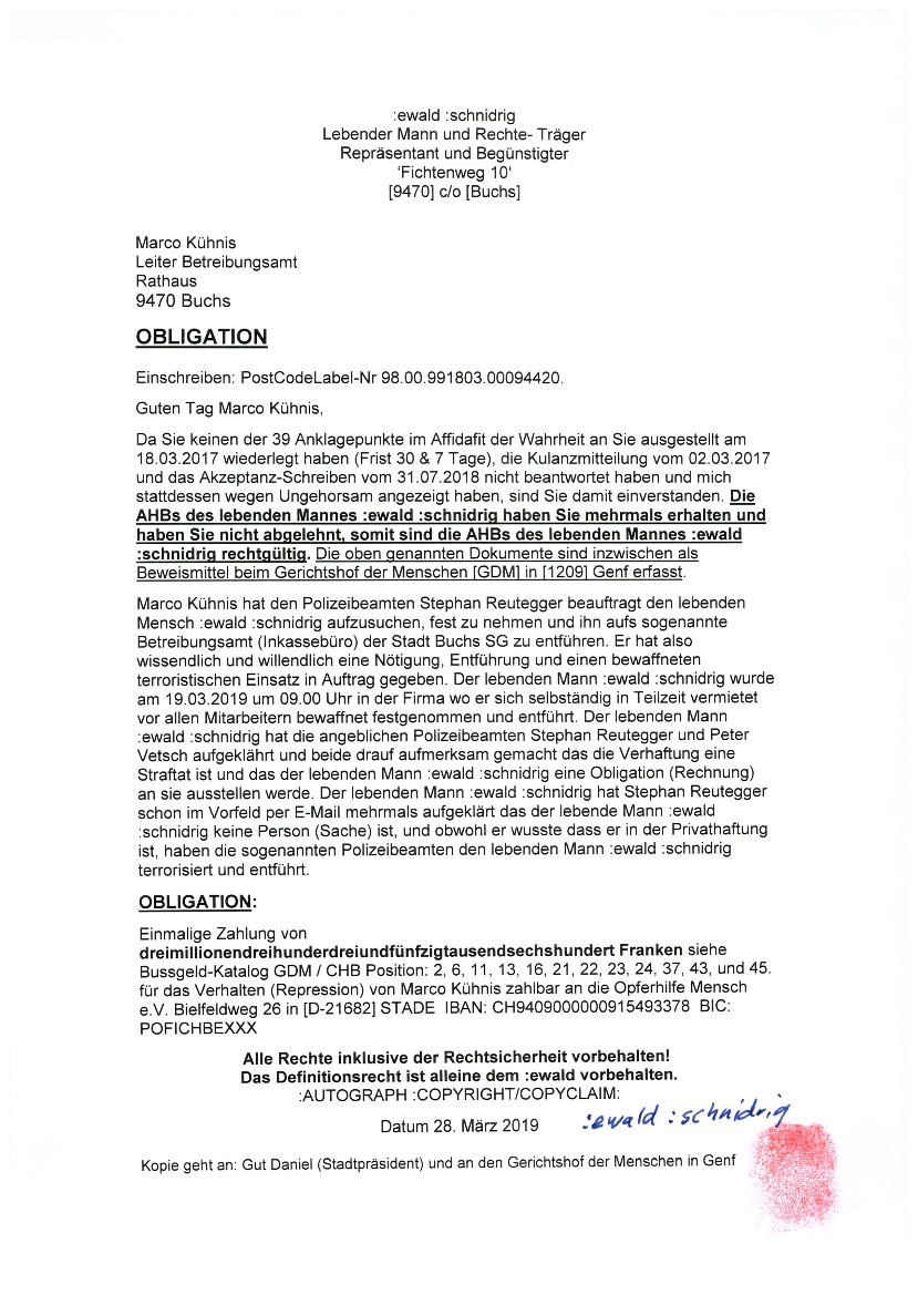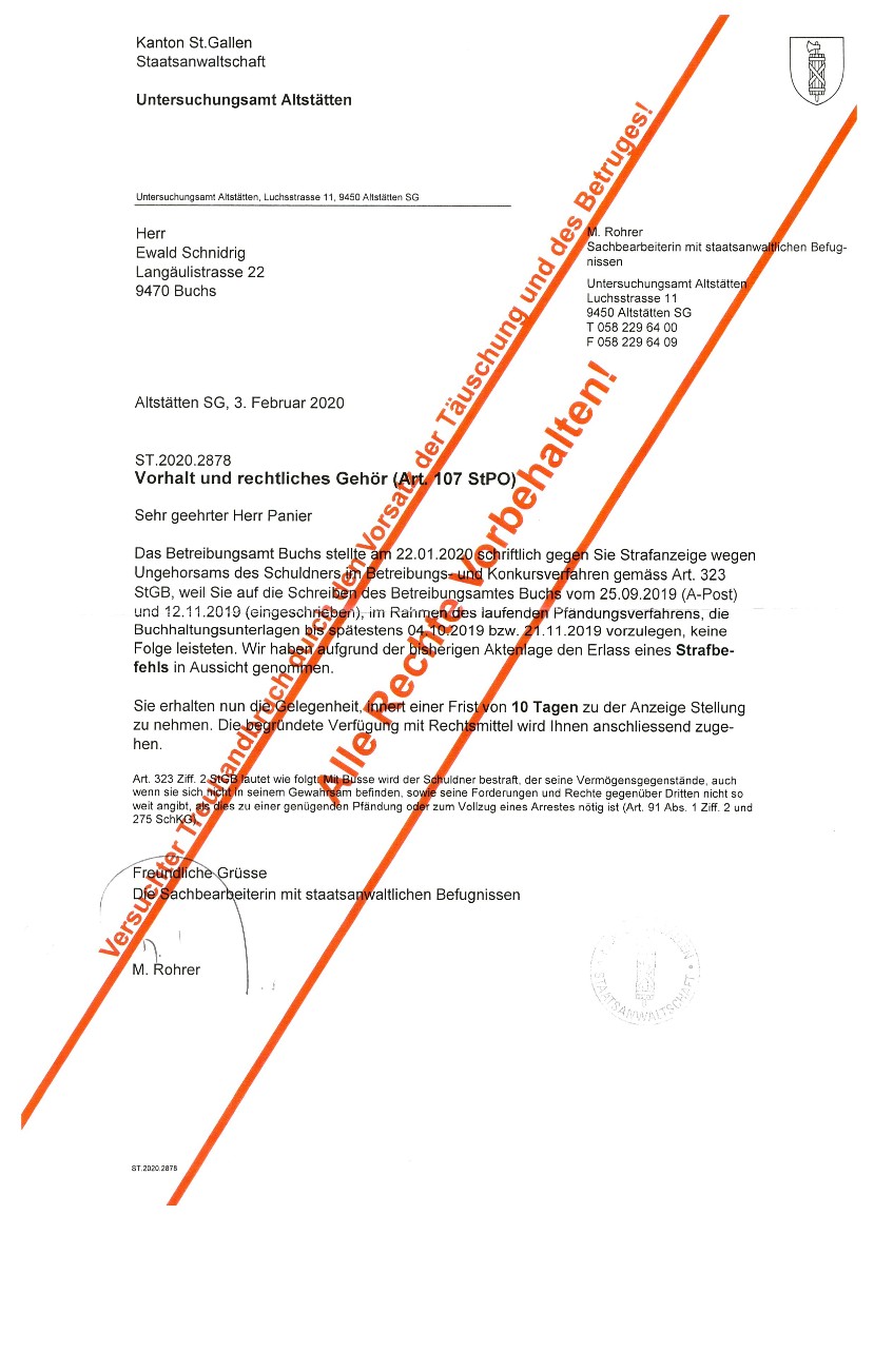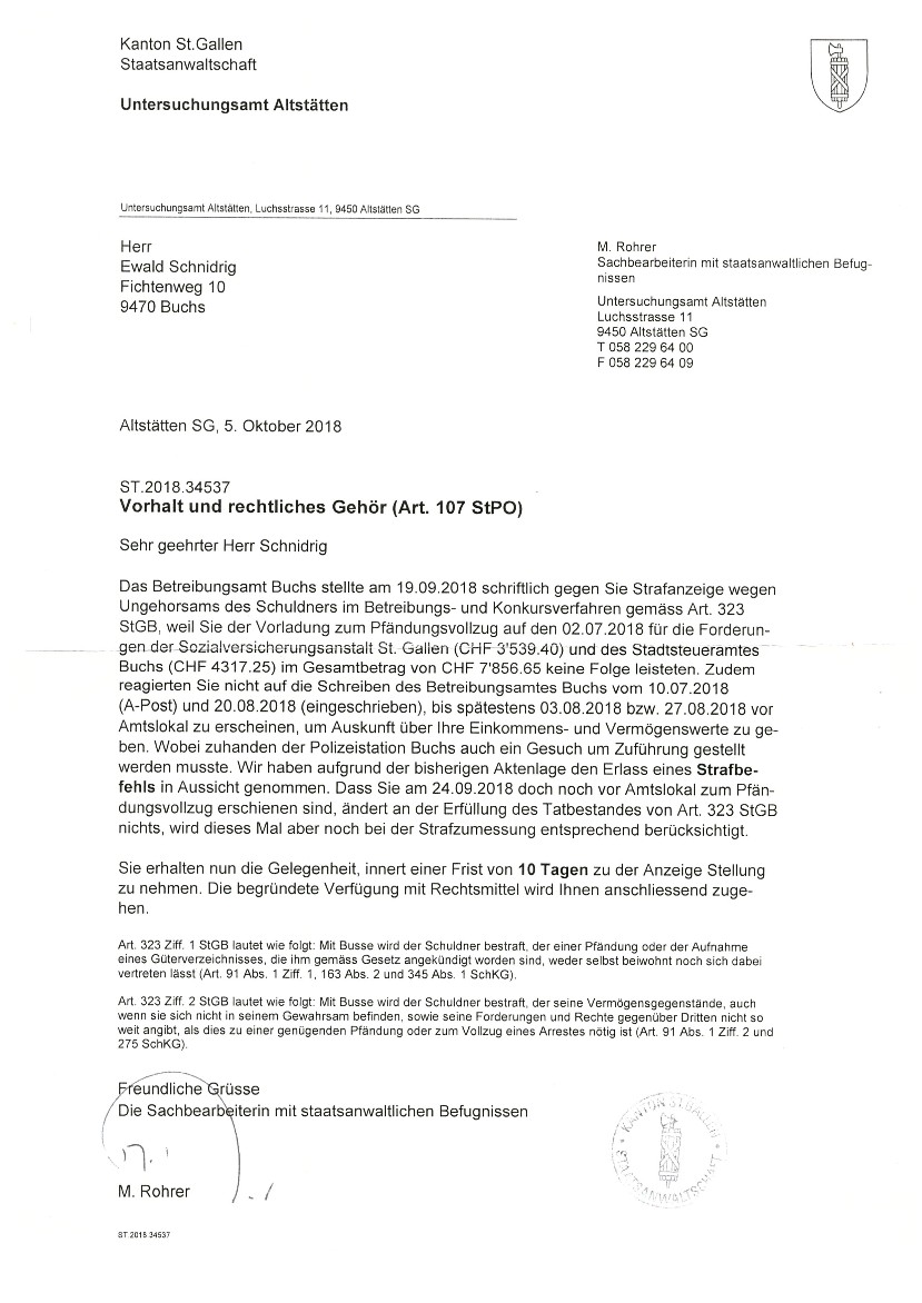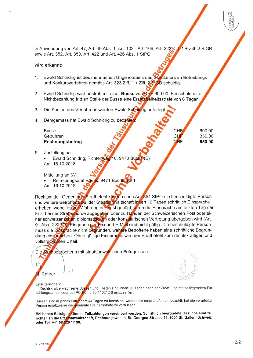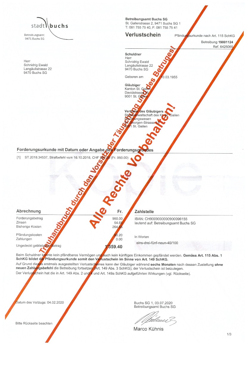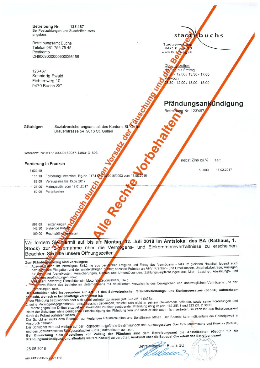 wenn ein leitender Bediensteter der Firma Stadtverwaltung Buchs SG (Zweigstelle des sogenanntem Betreibungsamt) eine zu Unrecht geforderte Schuld nach einer Zurückweisung des angeblichen Schuldners, in seinem Namen für den angeblichen Schuldner beim Bezirksgericht Mels Rechtsvorschlag macht und somit eine Geldmaschine in Bewegung setzt. (siehe nachfolgende Dokumente).......