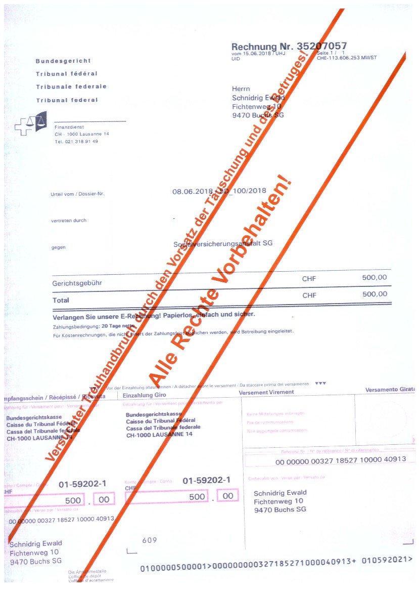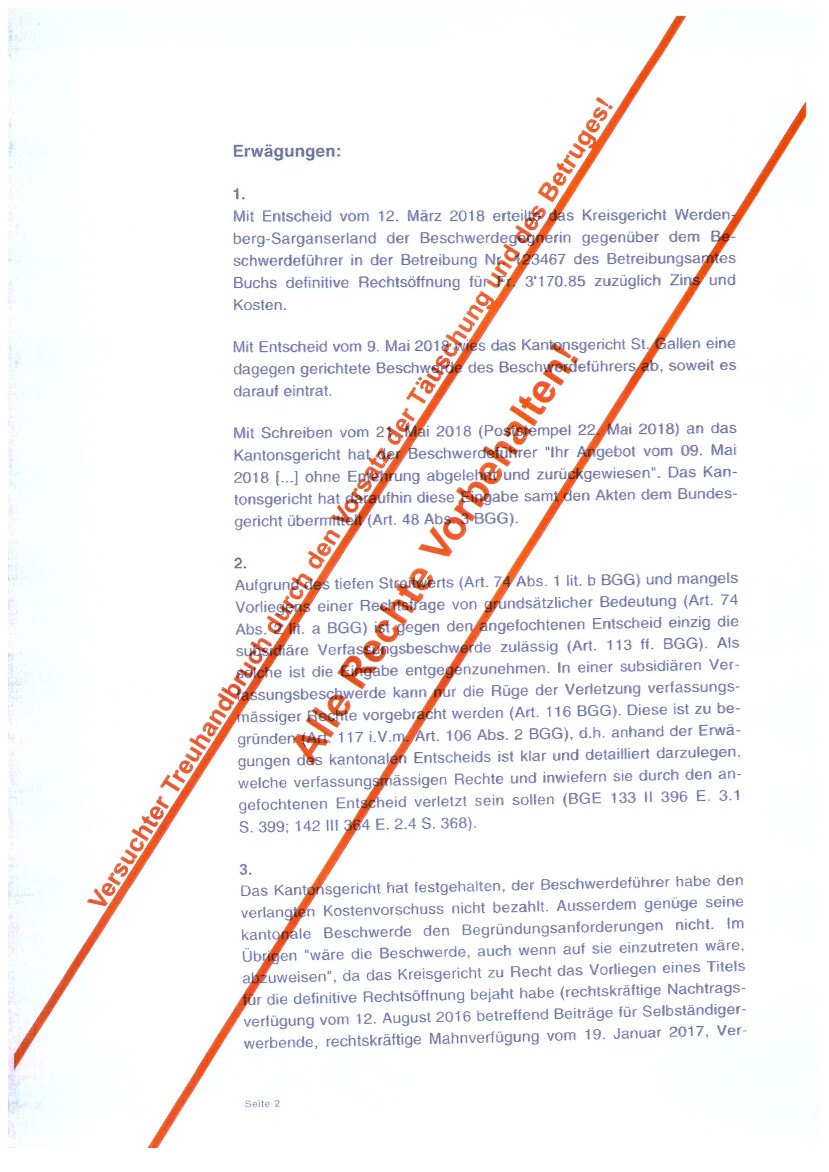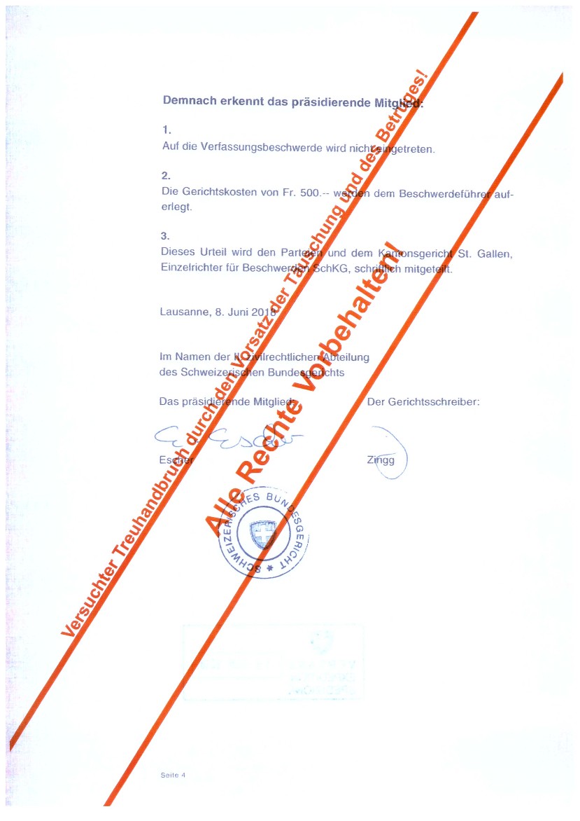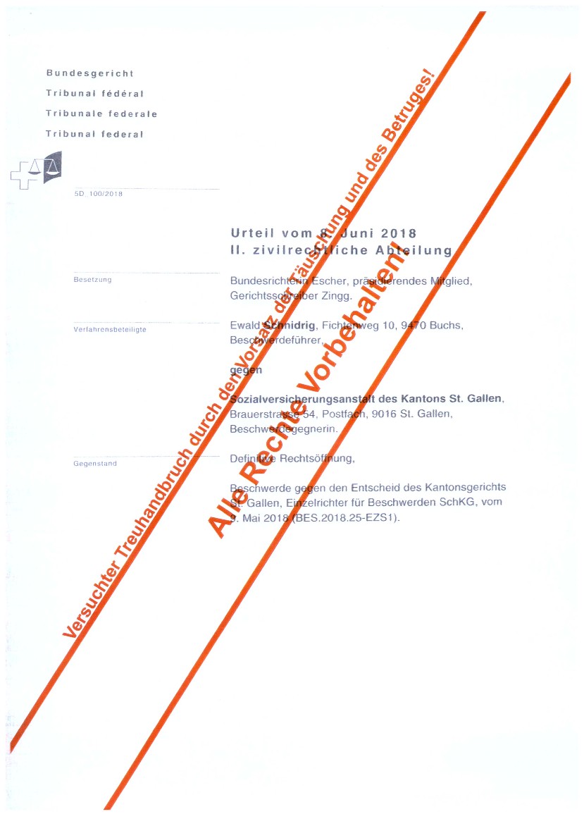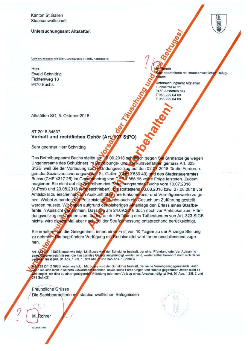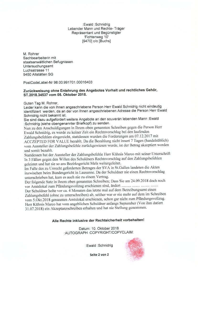 wenn ein leitender Bediensteter der Firma Stadtverwaltung Buchs SG (Zweigstelle des sogenanntem Betreibungsamt) eine zu Unrecht geforderte Schuld nach einer Zurückweisung des angeblichen Schuldners, in seinem Namen für den angeblichen Schuldner beim Bezirksgericht Mels Rechtsvorschlag macht und somit eine Geldmaschine in Bewegung setzt. (siehe nachfolgende Dokumente).......