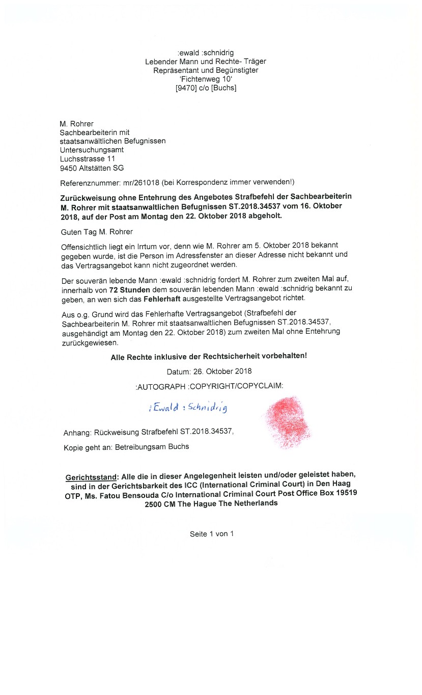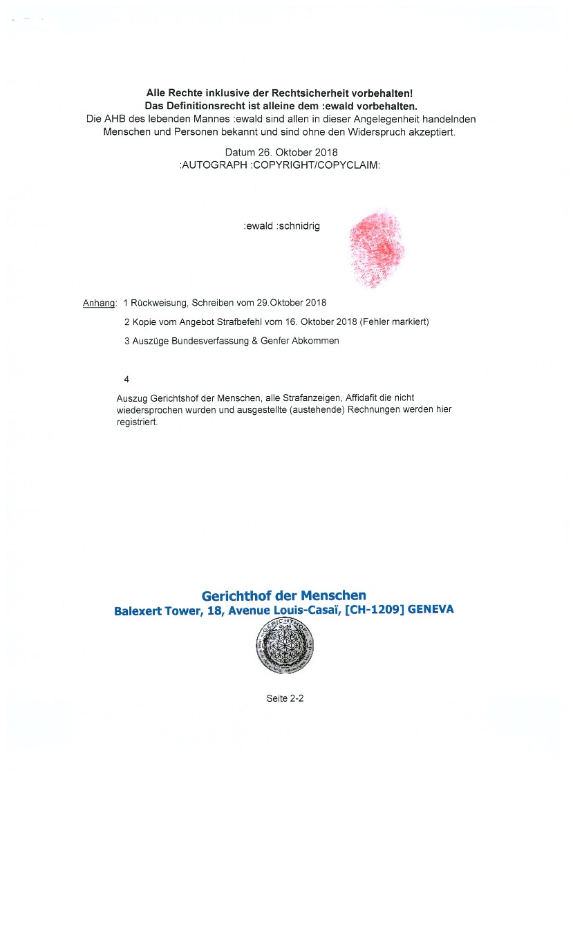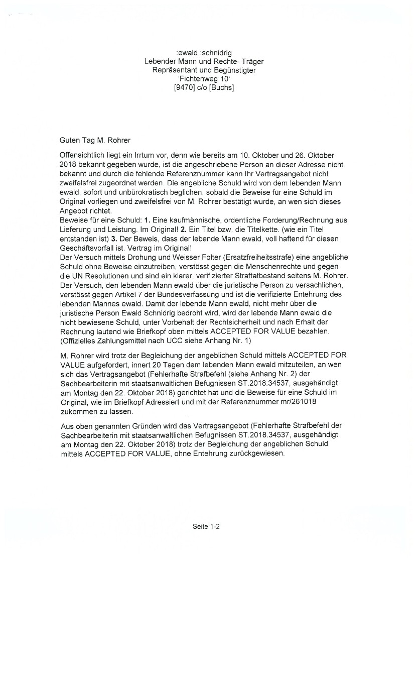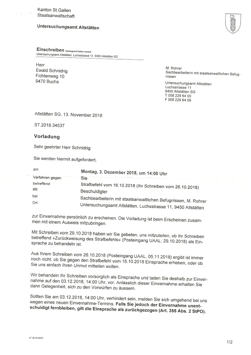 Im Oktober 2016 erhielt der lebende Mann ewald SCHNIDRIG wegen übertretender Geschwindigkeit auf der deutschen Autobahn nähe Köln eine Einladung zum Verhör nach Köln,