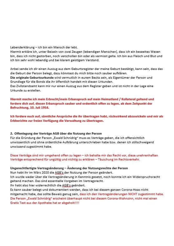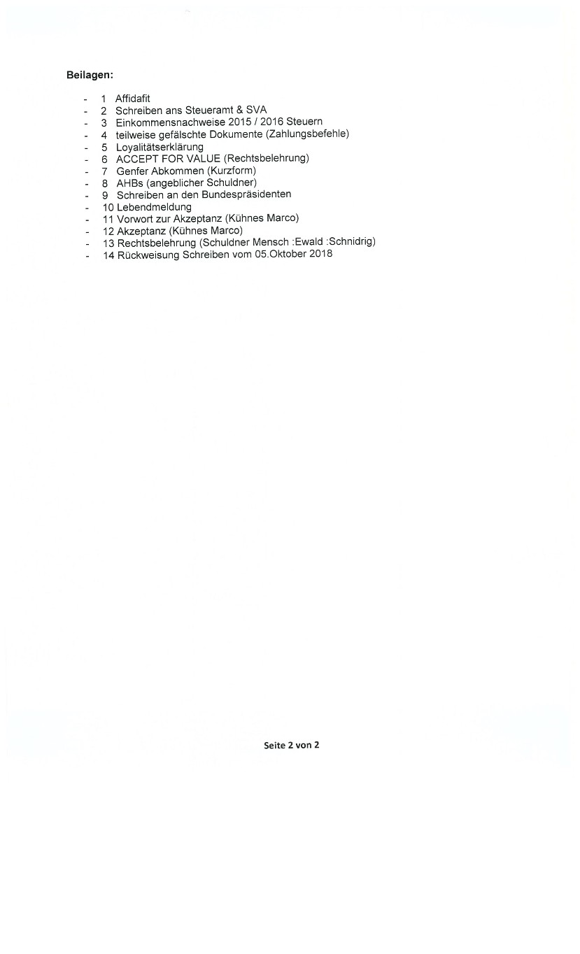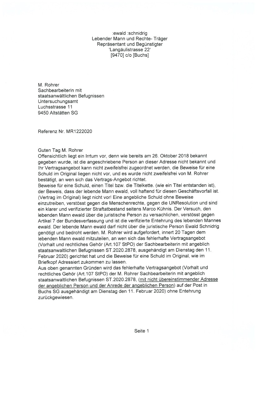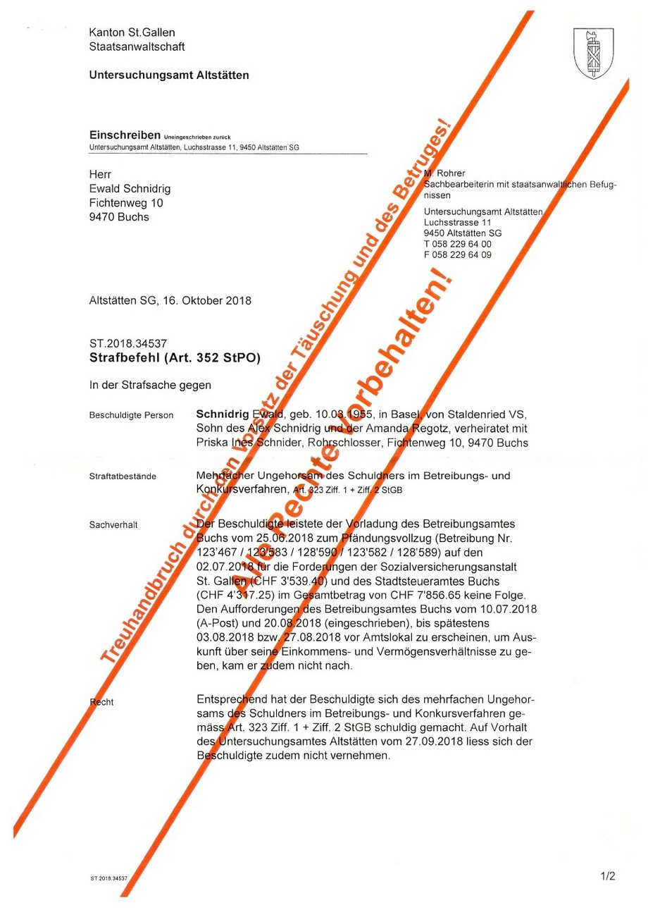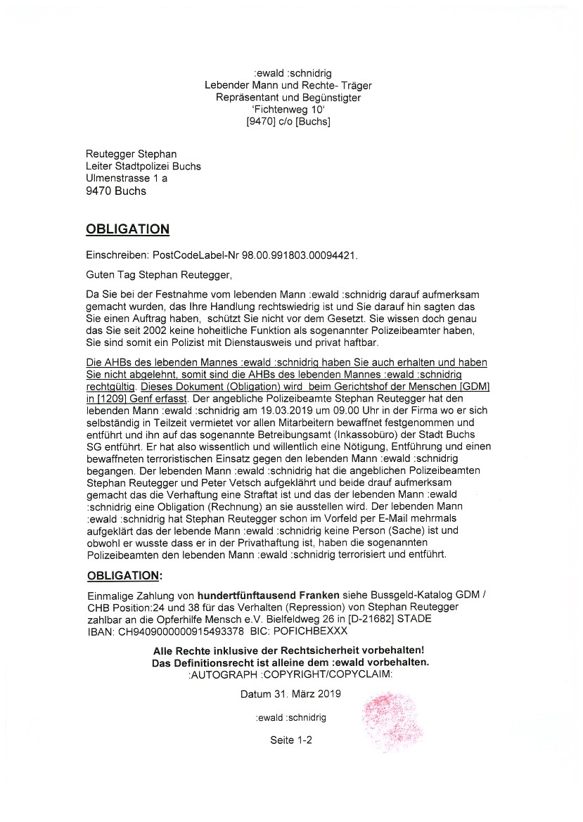 Im Oktober 2016 erhielt der lebende Mann ewald SCHNIDRIG wegen übertretender Geschwindigkeit auf der deutschen Autobahn nähe Köln eine Einladung zum Verhör nach Köln,