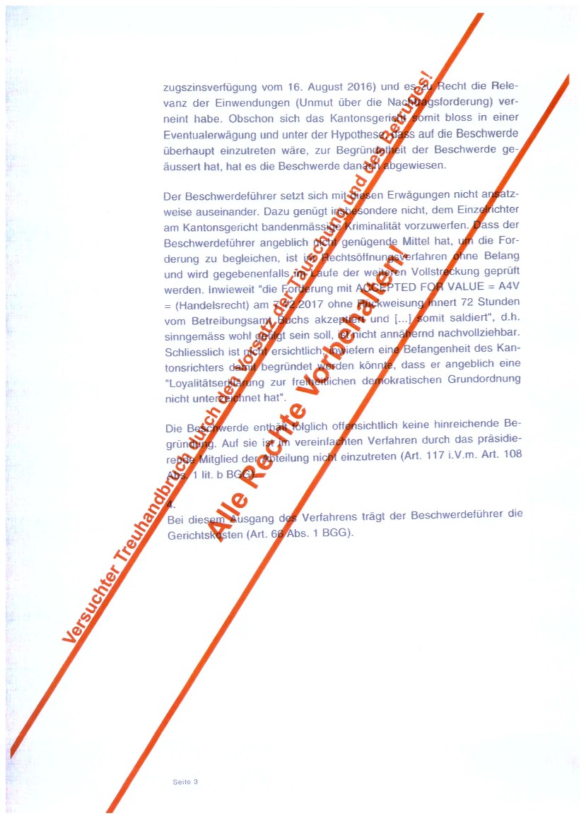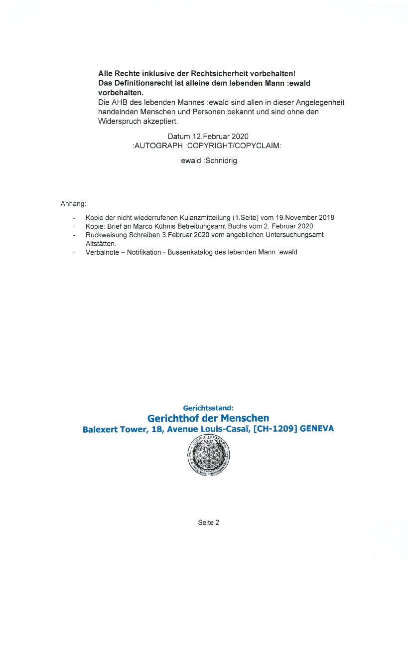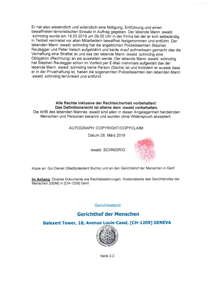 Nach geltendem „Recht“ gilt für jeden Menschen die Unschuldsvermutung, heisst so lange eine angebliche Schuld nicht bewiesen ist, keine Gerichtsverhandlung statt fand und kein amtlicher Richter mit seinem vollständigen Vornamen und Familiennamen ein sogenanntes Urteil unter seinem Namen unterschrieben hat, ist jeder Mensch FREI. Bis jetzt wurden ausschliesslich illegale Taten auf Grund von Behauptungen durch gesetzt, ohne jegliche Grundlage. Die von uns gelieferten