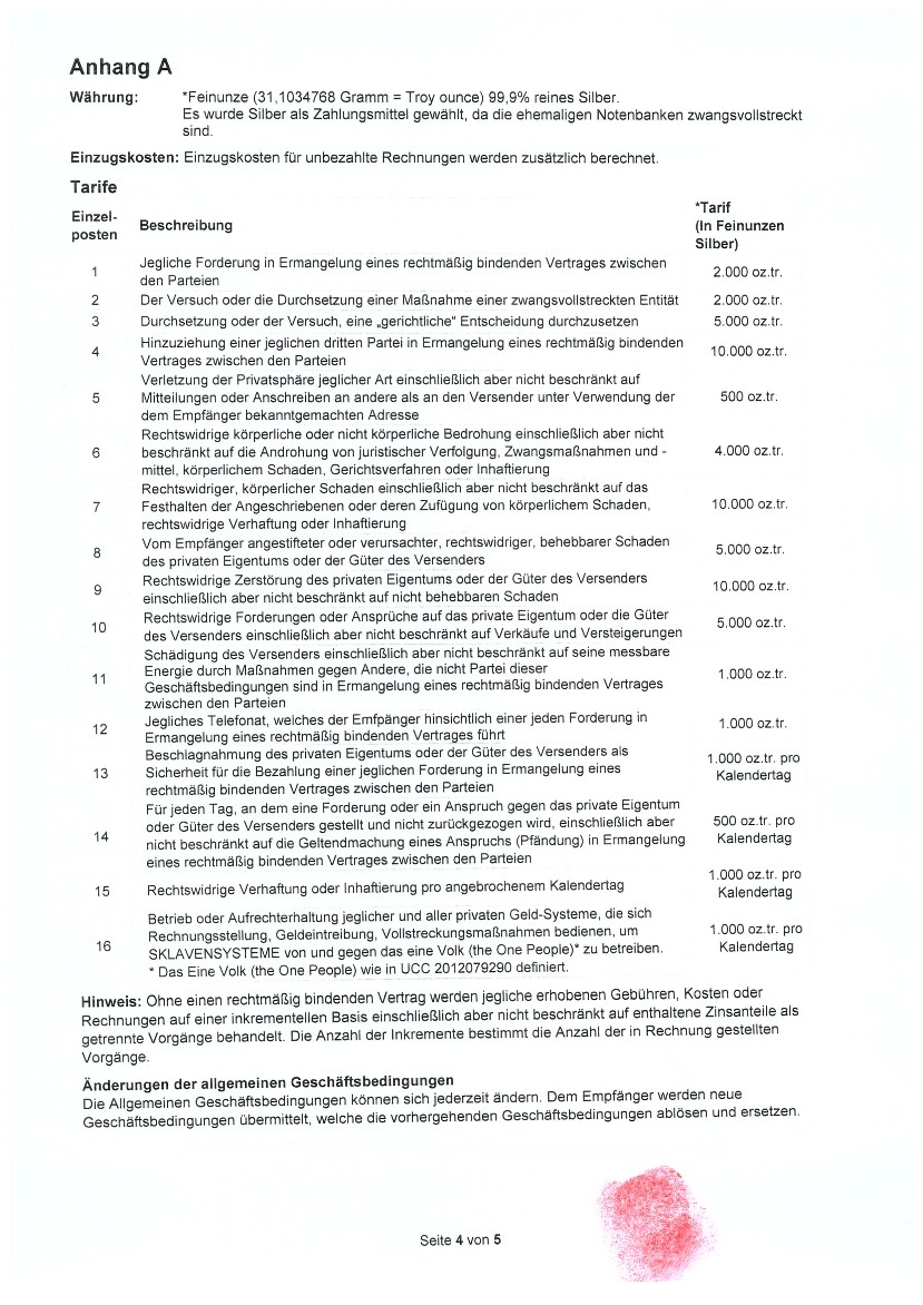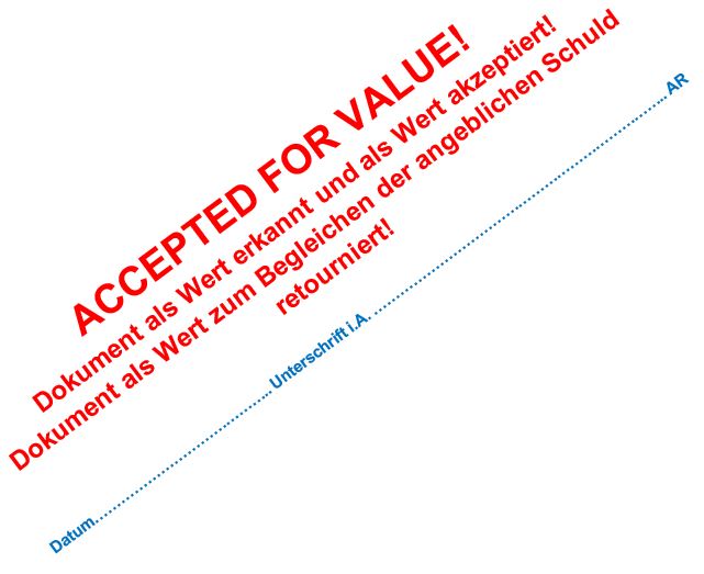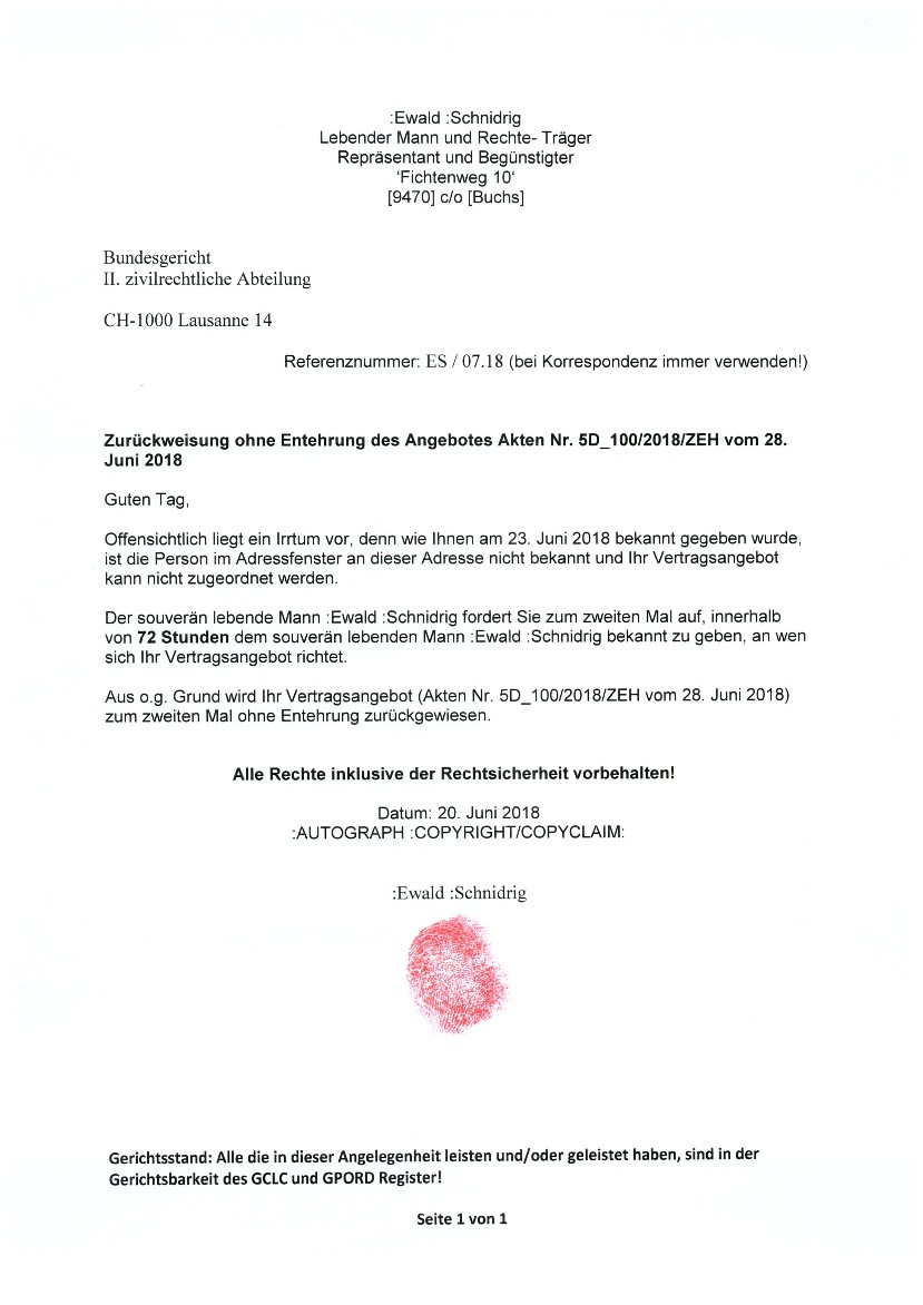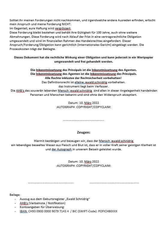 Artikel 17 1. Jeder hat das Recht, sowohl allein als auch in Gemeinschaft mit anderen Eigentum innezuhaben. 2. Niemand darf willkürlich seines Eigentums beraubt werden. Artikel 30 Keine Bestimmung dieser Erklärung darf dahin ausgelegt werden, daß sie für einen Staat, eine Gruppe oder eine Person irgendein Recht begründet, eine Tätigkeit auszuüben oder eine Handlung zu begehen, welche die Beseitigung der in dieser Erklärung verkündeten Rechte und Freiheiten zum Ziel hat. Strohmann-Prinzip - Klausel Ein Strohmann ist eine juristische, tote Person, die mittels „Geburtsurkunde“ geschaffen wurde um vom Strohmann die Zahlung von Strafen und nicht existenter Kosten zu fordern. Darüber wurde ich bei Geburt nicht informiert und das hat nichts mit mir als biologischem Mensch zu tun! Hiermit lehne ich als biologischer, auf natürliche Weise auf die Welt gekommene Mensch die Vertretung und die Haftung für diesen Strohmann ab! Vereinbarung (Stand: Mai 2015) Jeder, der meine oben genannten Grund- und Menschenrechte gegen meinen Willen verletzt, willigt ein mir einen Schadensersatz in Höhe von 5 Millionen Schweizer Franken (in Worten fünf) in verfassungsgemässer Währung (Bargeld, Gold) zu zahlen, zahlbar sofort