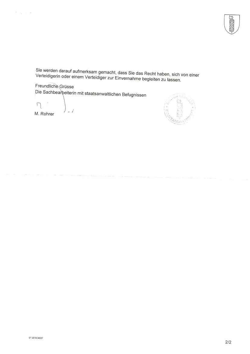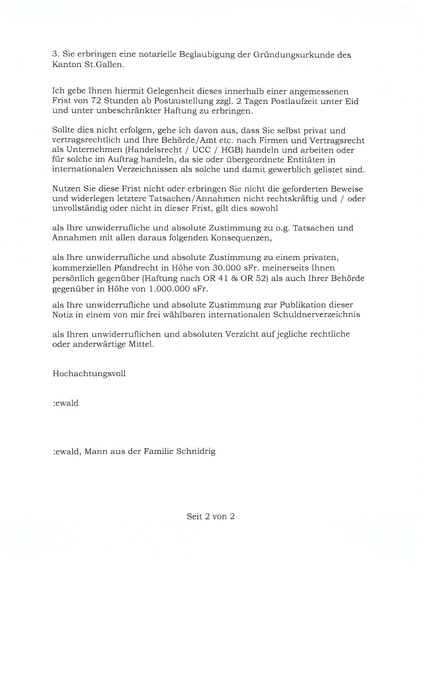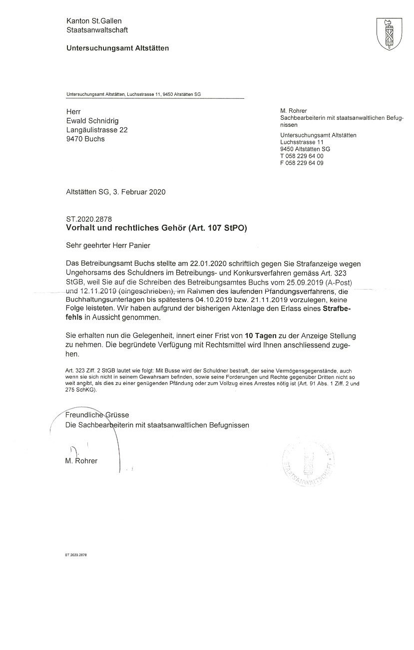 Doch auch die Ladung zu einer Anhörung durch die jur. PERSON EWALD SCHNIDRIG