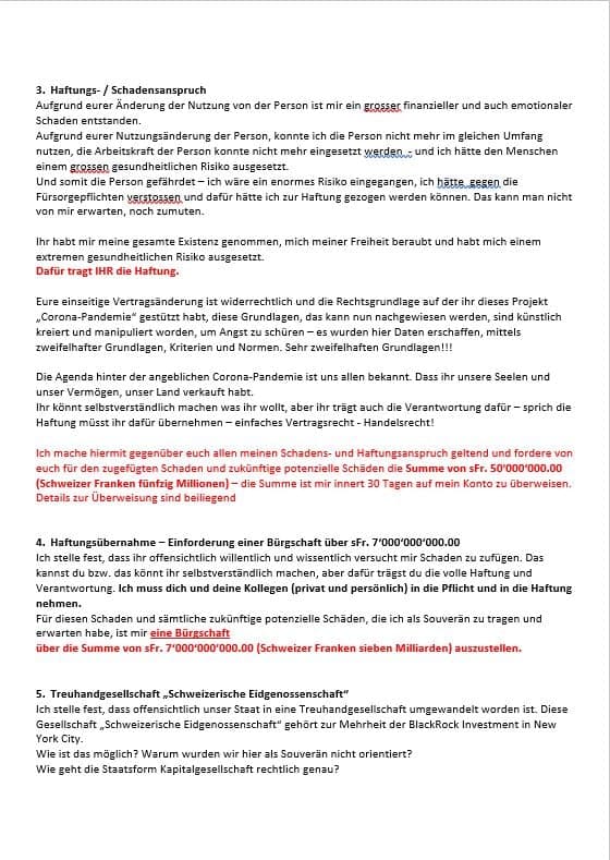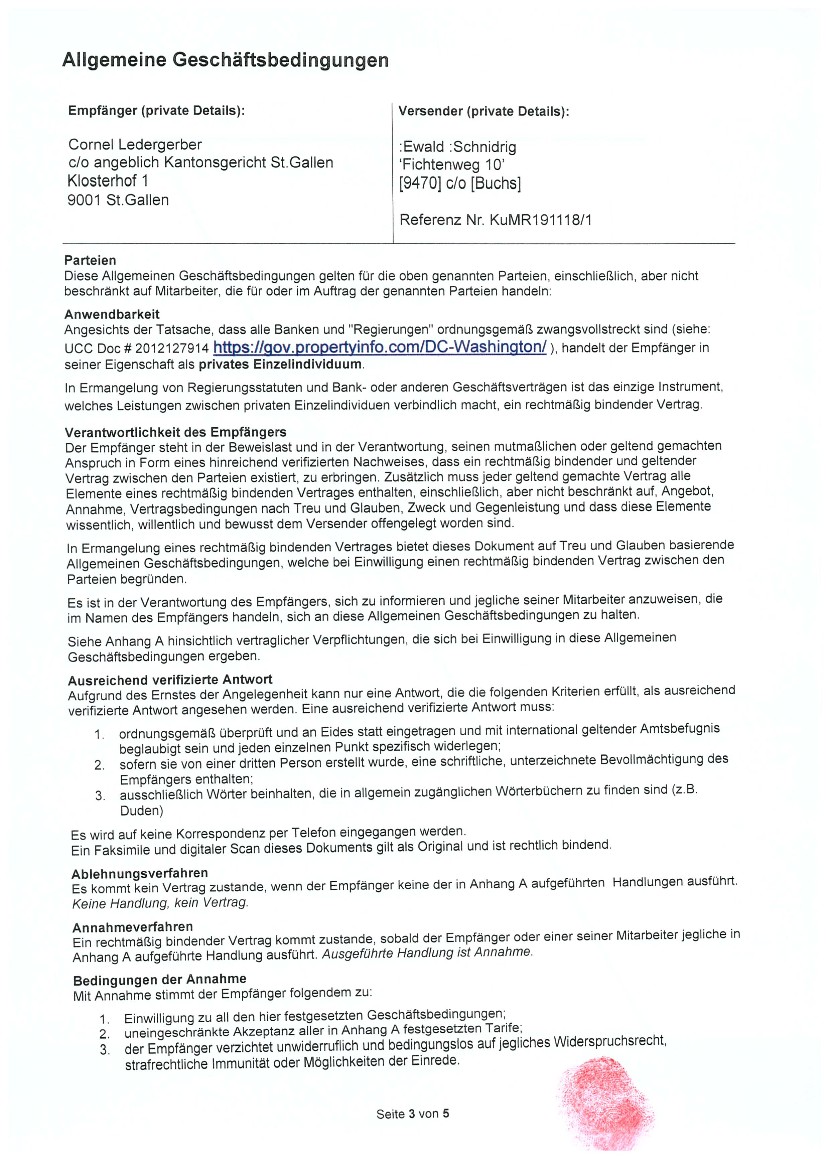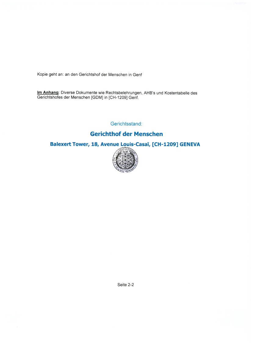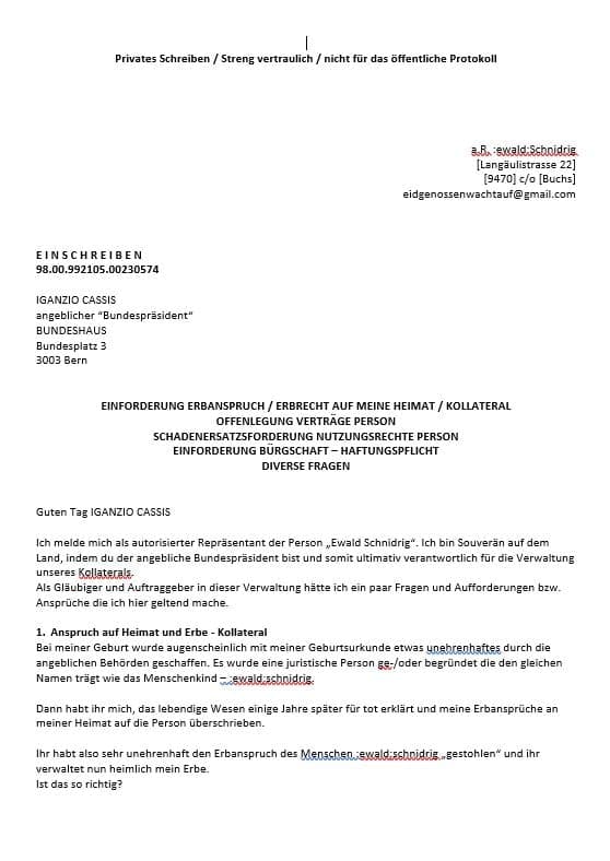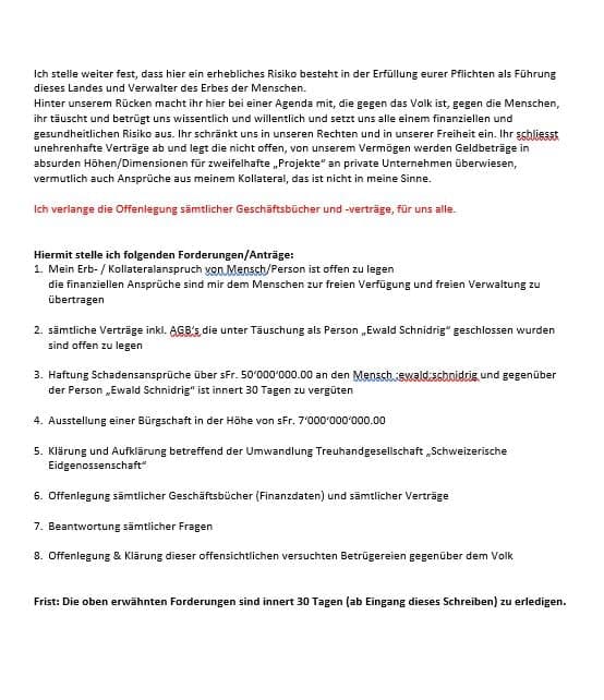 Schweizer Eidgenossenschaft, all ihre Organe, sowie sämtliche betroffenen oder interessierten Personen oder Personengesellschaften, sowie deren Nachfolger. Ausserdem, in weiterer Folge und für alle Zeit an sämtliche Nationen und Personen, sowie alle Menschen auf dem Planeten Erde.