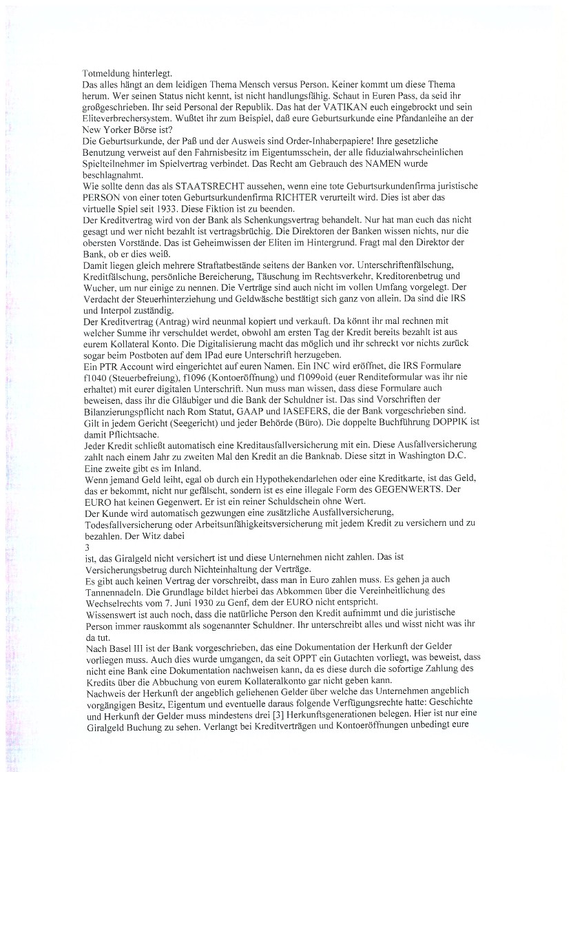 Uniform Commercial Code (UCC) zu Deutsch: Einheitliches Handelsgesetzbuch. UCC war eine von der Kirche nach dem Römischen Recht geschaffene Registratur, mittels derer weltweites Handelsrecht etabliert wurde. Damit war gesichert, dass Körperschaften untereinander Geschäfte betreiben konnten. Der UCC ist die Bibel des Handels. Es beschließt präzise die Art des internationalen Austausches von Gütern und Leistungen. In der Tat dreht sich das gesamte Handelssystem um die UCC-Registratur. Leider wird die UCC-Registratur nicht im Jurastudium gelehrt, es verbleibt im Herrschaftsbereich der Unternehmen und ihrer Funktionäre, die die Angestellten ihrer Rechtsabteilungen lediglich in die für sie erforderlichen UCCInformationen einweihen, um das Wissen dieses wichtigen Mechanismus „im Haus“ zu belassen. Warum gilt die UCC-Registratur nicht nur in Amerika sondern auch für Sie und Ihre Institution? Wie Sie gerade erfahren haben ist die UCC-Registratur dafür da, dass Körperschaften international Handel betreiben dürfen. Zu dem internationalen Handel gehören z.B. auch alle Finanzämter, Gemeinden, sogenannte Regierungen und alle Banken... da alle Banken sowieso den Zentralbanken unterliegen und die Zentralbanken unterliegen wiederum der Federal Reserve Bank, die bekanntlich in den USA ist. Viele unwissende Unternehmer und Geschäftsführer beziehen sich immer auf das hier in Deutschland geltende Handelsregister, wissen aber nicht, dass das Handelsregister ebenfalls auf dem UCC basiert.