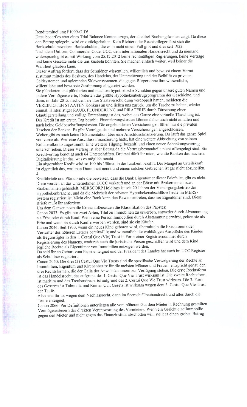 geschlossenen Vertrag abwerten, kontrollieren, entführen, ausrau-ben oder sonstige das Sein des Gegenübers mindernde Straftat begehen. So sind in diesem einheitlichen Handelsgesetz alle Verhaltens-regeln für die Interaktion zwischen Menschen festgesetzt. Wer diesen Regel zuwider handelt, macht sich strafbar! Jeder ehemalige und illegal wirkende Söldner, ob [POLIZEI] oder [MILITÄR], ist lediglich ein selbstschuld-nerisch wirkender Mensch, der sich vor dem Gericht des Common Law verantworten muss, so er gegen den freien Willen des Menschen gegen den er agierte, oder gegen UCCGesetz handelt.