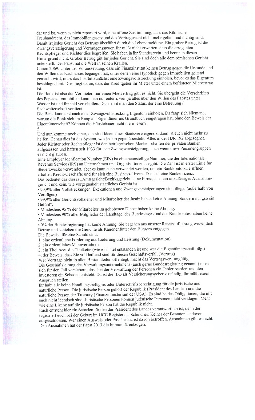 ** Seit dem Jahre 2002 sind ja alle Beamten und Beamtenstellen aufgehoben worden. Also kann es gar kein Betreibungsamt mehr geben. BETREIBUNGSÄMTER sind heute nur noch private Inkassobüros. Kein Betreibungsbüro hat heute eine Legitimation, eine Amtshandlung durch zu führen. Somit sind alle Betreibungsurkunden / Schuldscheine / Pfändungen ungültig. Die Betreibungsbüro Angestellten machen sich strafbar. Sie sind also verpflichtet, jegliche Betreibungsurkunde abzulehnen und zu retournieren.