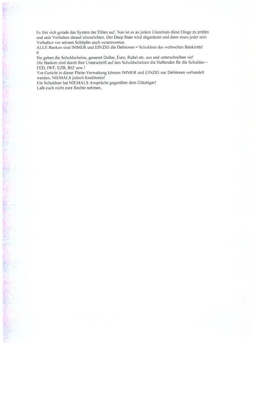 Diese Mitteilung bestätigt, dass Sie auf diesem Wege korrekt davon in Kenntnis gesetzt wurden. Wobei damit genüge getan ist, dies - im Sinne der organschaftlichen Vertretung -lediglich den höchsten Instanzen und nicht auch allen untergeordneten Instanzen gesondert mitzuteilen. Und, dass jeder, der mich in meinen rechtmäßigen Aktivitäten stört, nachdem