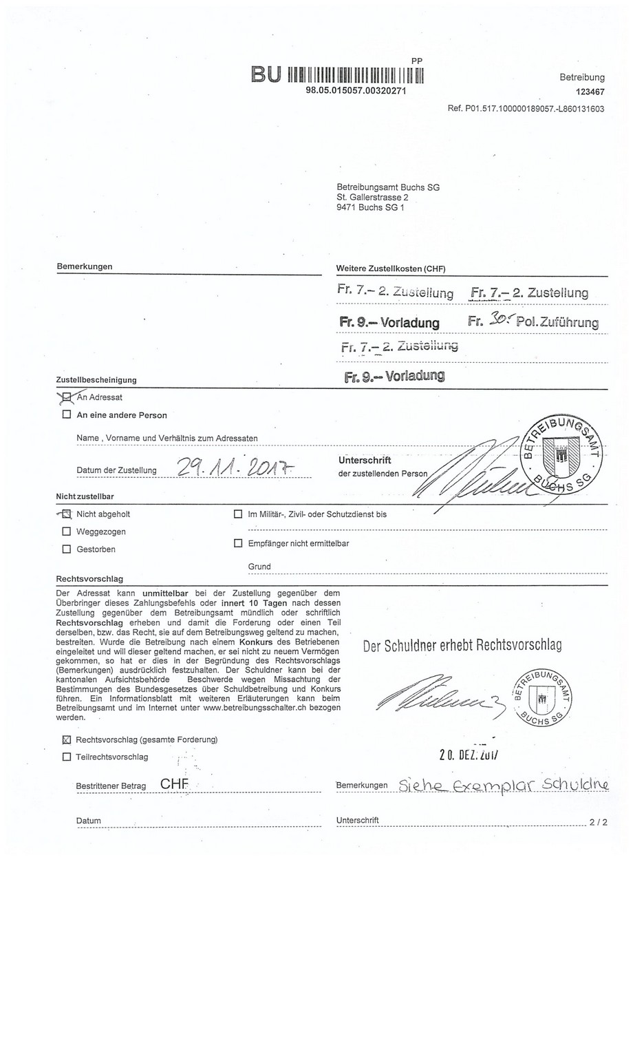 Mein, an das sogenannte Betreibungsamt zurückgewiesenes Dokument