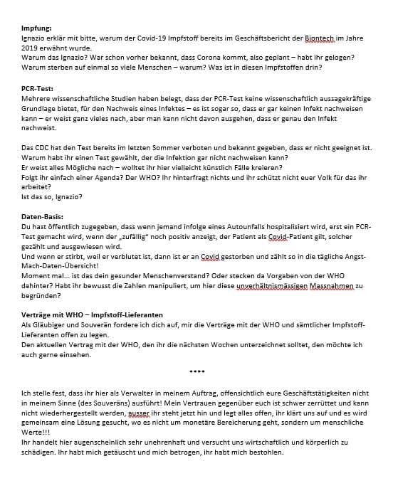 Der Adressat Frau Cetin, geb. tätig im [Amt für öffentliche Ordnung] hat binnen 72 Stunden nach Zustellung dieses Schreibens eine Genehmigung / Legitimation des Deutschen Reiches dem Souverän und Unterzeichner zuzustellen bzw. vorzulegen und zu erklären, wer sie, wann nach welchem Rechtskreis im [Amt für öffentliche Ordnung] autorisiert bzw. legitimiert hat. Erfolgt diese nicht gilt ultra vires.