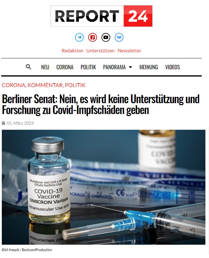 "Diese Antwort des Berliner Senats auf eine Schriftliche Anfrage zum Thema “Post-Vac-Syndrom” ist ein Schlag ins Gesicht jedes Bürgers, der sich im guten Glauben an Sicherheit und Wirksamkeit die experimentellen Covid-Gentherapeutika injizieren ließ: Schwarz auf weiß ist dort zu lesen, dass – anders als bei “Long Covid” – keinerlei Forschung zu Impfnebenwirkungen und -schäden geplant ist und dass man auch keine spezielle Unterstützung für die zahlreichen Betroffenen erwägt."
