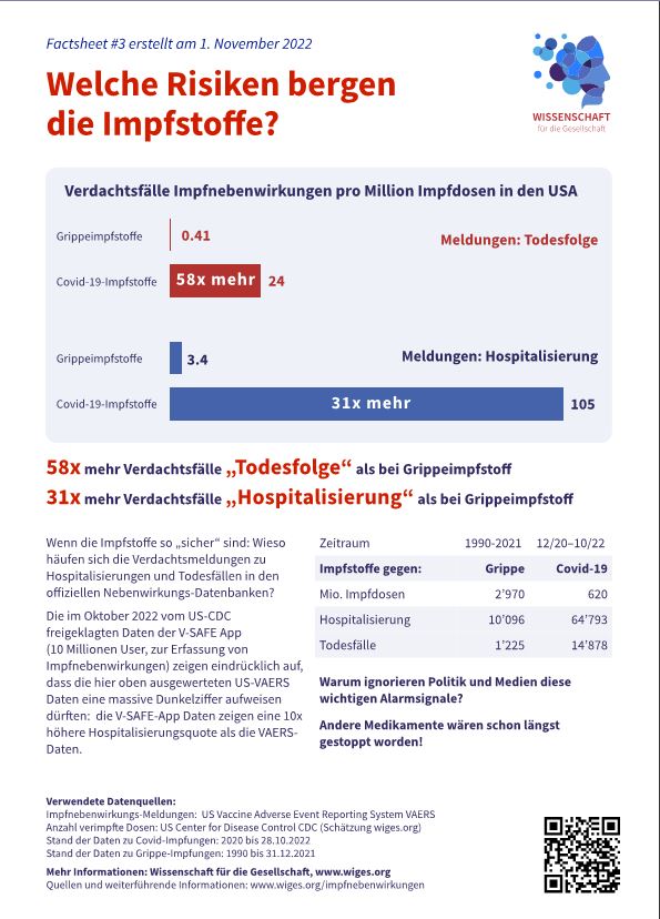 Verwendung einer giftigen Substanz Zusätzlich zu Art. 123 Ziff. 1 StGB (Grundtatbestand) ist auch Art. 123 Ziff. 2 StGB (qualifizierter Tatbestand) zu prüfen. Dieser sollte vorliegend deshalb zur Anwendung kommen, weil das von Pfizer (mit dem Namen BioNTech) als Covid-19-Impfung verbreitete Arzneimittel auch Substanzen enthält, welche offiziell als Gift klassifiziert sind und welche bei vielen Menschen wie ein Gift wirken. Zum Nachweis des giftigen Gehaltes bitte ich Sie, die Ausführungen in dem bereits erwähnten „Evidenzreport“ zur Strafanzeige der 6 Impfopfer zu konsultieren (Seiten 36- 48)2 . Dort finden Sie auch genaue Hinweise zur international offiziell anerkannten Toxizität der Lipidnanopartikel. Zudem verweise ich auf die öffentlich einsehbaren Register zu schweren Nebenwirkungen aus den USA (VAERS)3 , aus der EU (EMA) und von Swissmedic. Aus der Übersicht zu den Daten der VAERS USA können Sie ablesen, dass die Covid-19- Impfungen sogar 58 Mal häufiger zu Meldungen über Todesfolgen führen als gewöhnliche Grippeimpfungen. Verständlich zusammengefasst auf der Homepage der Vereinigung: Wissenschaft und Gesellschaft, WIGES auf: