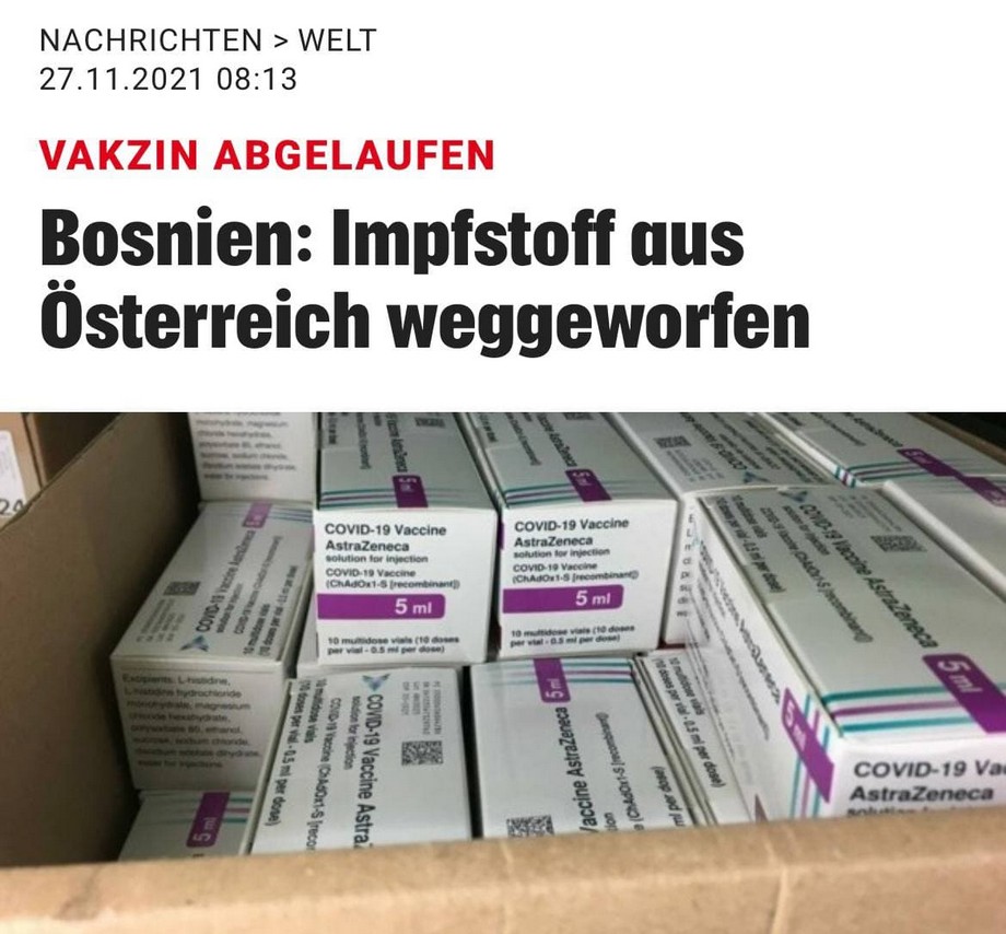 Am 10. August hat Österreich rund eine halbe Million Dosen des Corona-Impfstoffs von AstraZeneca an Bosnien gespendet. Wie jetzt bekannt wurde, musste ein Teil davon nun weggeworfen werden, weil das Vakzin abgelaufen ist. Konkret zuständig für derartige Spenden ist das von der ÖVP geführte Außenministerium. Für den Ankauf des Covid-19-Impfstoffs war österreichisches Steuergeld aufgewendet worden.