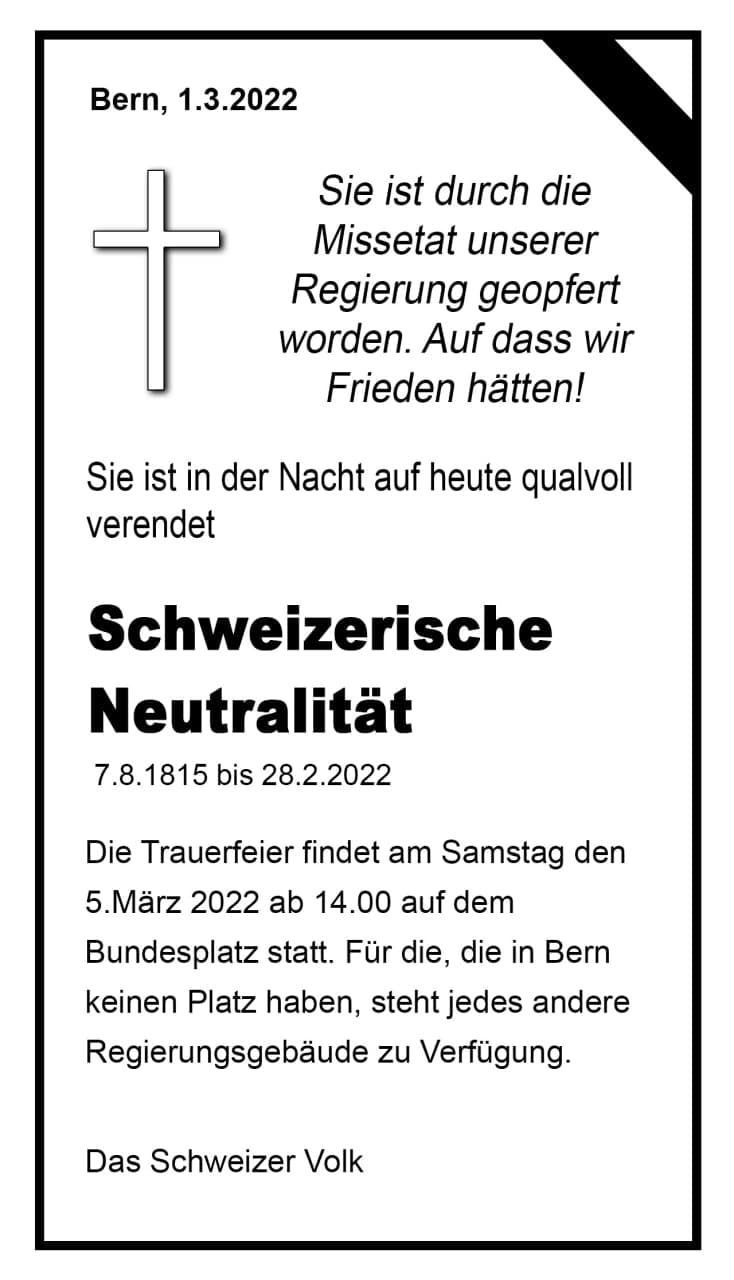 Durch die Aufhebung der Neutralität hat die Schweiz zugleich ihre bisherige Glaubwürdigkeit als deeskalierender Vermittlungs- und Schlichtungspartner für Kriegsparteien komplett verloren. Das können auch wohlklingende Beschwichtigungen nicht mehr retten.
